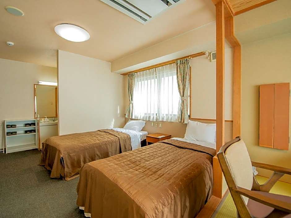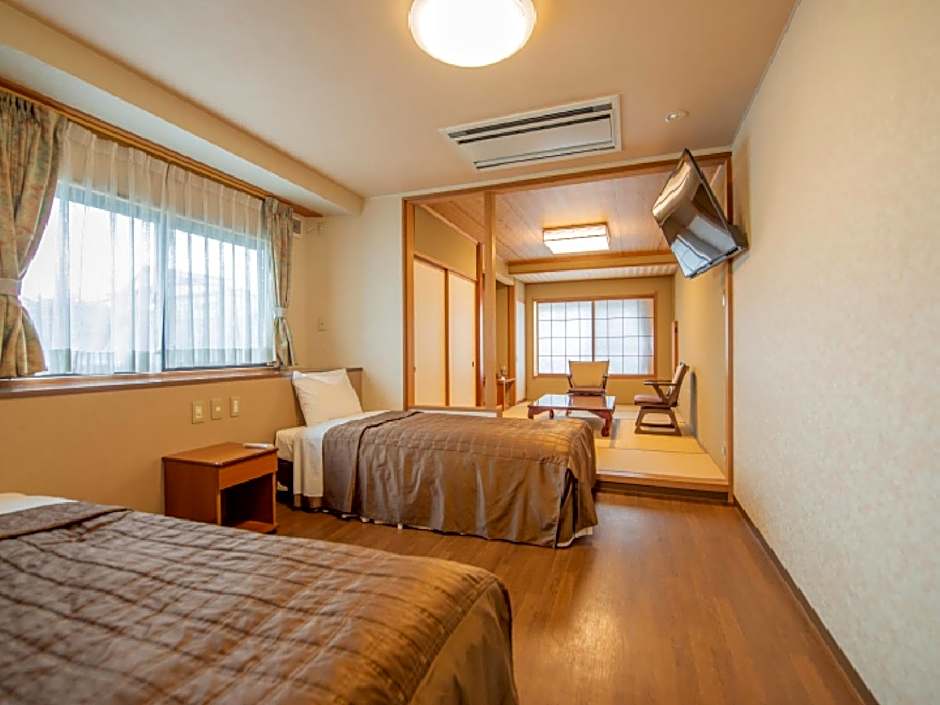 The twin room features a shared bathroom, air conditioning, tatami, as well as a seating area with a flat-screen TV. This twin room has an electric kettle, heating and a TV. The unit offers 2 beds.